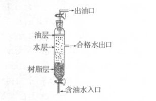 筆者設計的大孔樹脂不僅對水中微量油具有較好的去除效果,而且能夠利用類萃取的原理除油并達到自動再生的目的。樹脂的除油過程在圖2所示的層析柱中進行,利用大孔樹脂的親油疏水性從凝結水中分離乳化油分子和溶解油分子,并自行進行破乳、捕捉、富集,及時將水中被乳化的小油滴黏附在樹脂表面,隨著樹脂處理水量的增加,小油滴不斷凝聚到一起形成大油滴,當這些大油滴達到了臨界體積后,通過水在層析柱內的流動沖擊,富集的油以大油滴的形式自動脫離樹脂表面,并隨水漂流向上,利用水和油的密度差,油逐漸富集到水面,當富集到一定程度時,水面上形成清晰可見的油膜并逐漸增厚,從而達到了油與水分離的目的。脫油后的樹脂重新開始自行破乳、捕捉、富集,在該循環過程中,樹脂不斷自動再生,始終保持良好的工作性能。