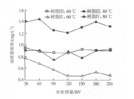 圖3是樹脂Ⅲ與樹脂Ⅳ分別在60、80℃對10mg/L的含油原液的去除效果。從圖3可以看出,樹脂Ⅲ與樹脂Ⅳ在60℃都能穩定地將油質量濃度控制在1mg/L以下,而在80℃時樹脂Ⅳ能將油質量濃度穩定控制在1mg/L以下,樹脂Ⅲ卻達不到,說明樹脂Ⅳ比樹脂Ⅲ具有更好的除油效果。這是由于樹脂Ⅳ含有兩種親油基團,而樹脂Ⅲ有一種親油基團。同時隨著水溫的升高,油在水中的溶解性逐漸增加,去除水中溶解的微量油也相對困難。具體參見http://www.bnynw.com更多相關技術文檔。