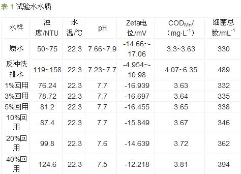試驗(yàn)在6 月—7 月進(jìn)行,試驗(yàn)期間,水廠所用混凝劑為聚合氯化鋁(PAC),投加質(zhì)量濃度為10~15 mg/L。水廠原水、濾池反沖洗水混合樣、不同回用比下混合水樣水質(zhì)見表 1。