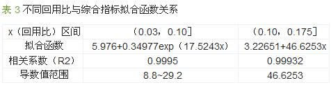 由圖 5 可以看出,隨著回用比的增大,綜合指標(biāo)數(shù)值增大,與圖 4 相比,它與細(xì)菌總數(shù)的變化趨勢(shì)走向大致相同,所以可以認(rèn)為細(xì)菌學(xué)指標(biāo)很大程度上決定著回用比例。為了更好地分析說明綜合指標(biāo)數(shù)值與回用比之間關(guān)系,得出最佳回用比范圍,在此對(duì)綜合指標(biāo)與回用比關(guān)系進(jìn)行擬合,擬合函數(shù)見表 3。
