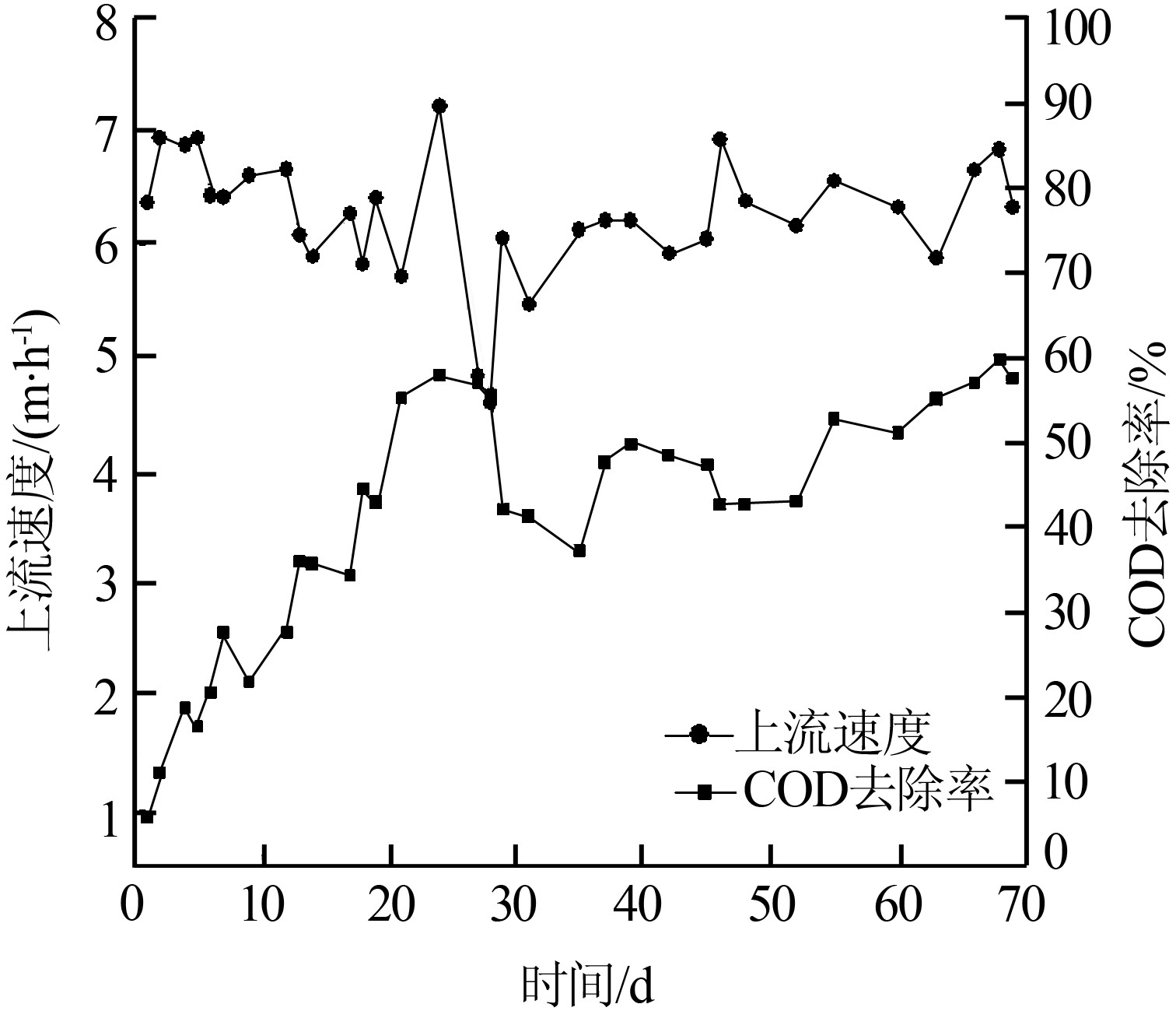 2.2上流速度對COD去除率的影響