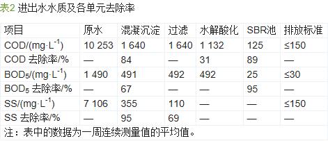 經(jīng)過近半年的調(diào)試,水解酸化池以及SBR池的污泥濃度達到設(shè)計值,出水水質(zhì)穩(wěn)定,各項指標均達到排放要求,具體的進出水水質(zhì)及各單元去除率如表2所示。