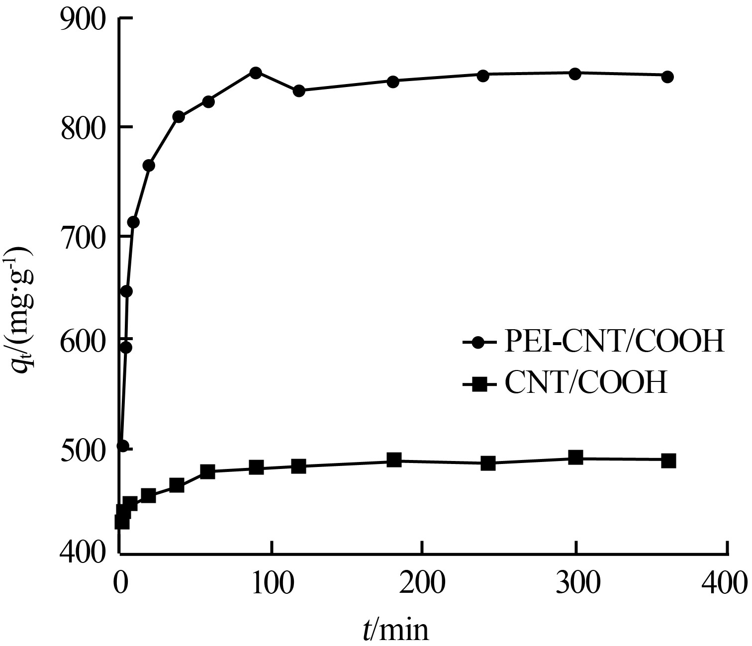由圖3可見,隨吸附時間的延長,吸附量逐漸增大,在大約180min時吸附量不再發(fā)生明顯的變化,表明吸附達到平衡,此時吸附容量達到了851.47mg/g,而未改性的CNT/COOH在相同條件下其最大吸附量僅為466.6mg/g。