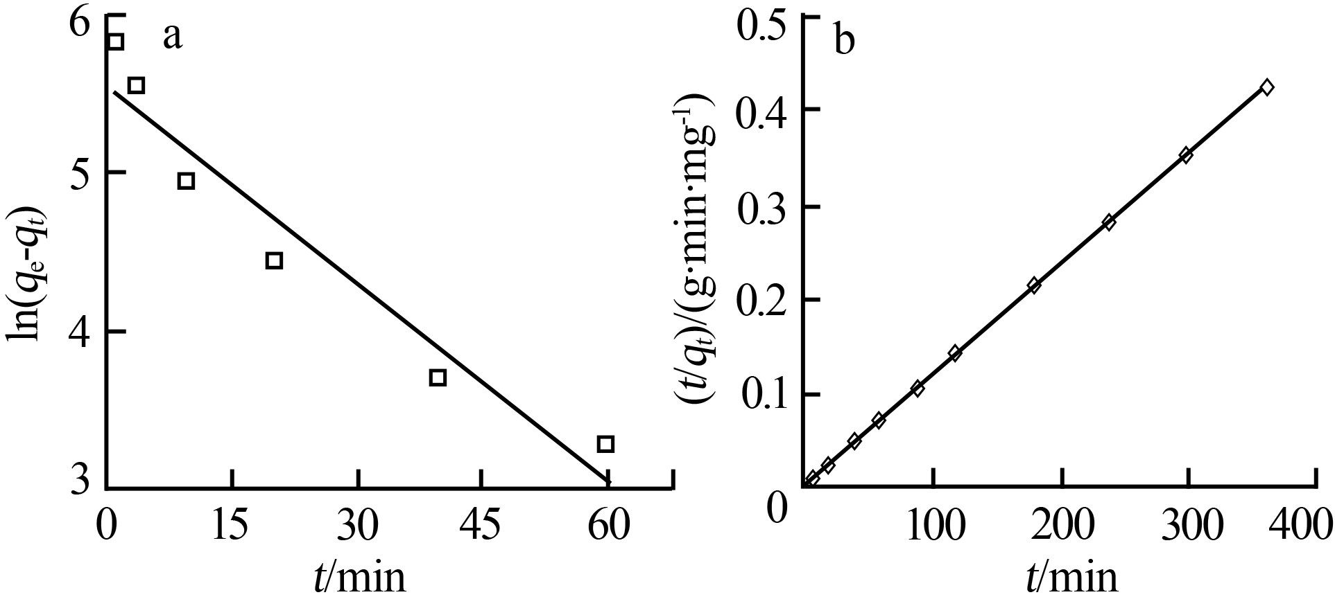 為了更好地研究時間對吸附的影響,對所有數(shù)據(jù)進行了兩種動力學(xué)模擬,兩種動力學(xué)模型可以有效地解釋吸附速率和潛在的速率控制階段。對所有數(shù)據(jù)分別進行假一階和假二階動力學(xué)模型線性擬合,分別如圖4(a)、圖4(b)所示。