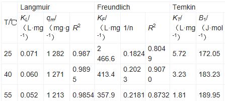 (3)通過計算熱力學(xué)數(shù)據(jù)說明吸附過程是一個自發(fā)放熱過程,且吉布斯自由能數(shù)值較小,說明吸附是一種物理吸附行為。