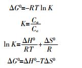 研究溫度對吸附過程的影響能夠為吸附過程中能量的改變和吸附機理提供有效信息。筆者通過熱力學(xué)計算研究了吸附機理。吉布斯自由能ΔG0,標(biāo)準(zhǔn)焓變ΔH0,標(biāo)準(zhǔn)熵變ΔS0通過下列公式計算得出:
