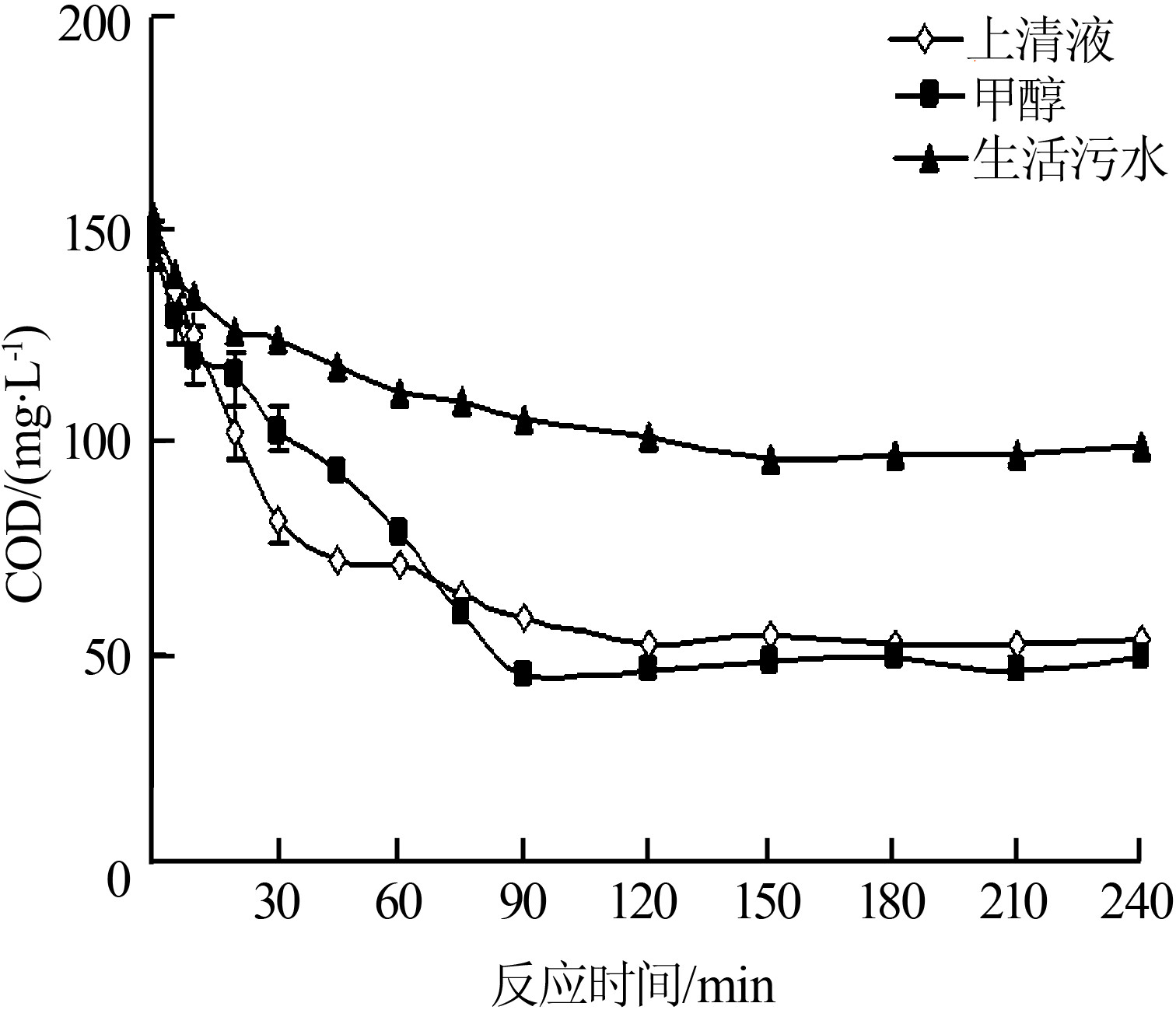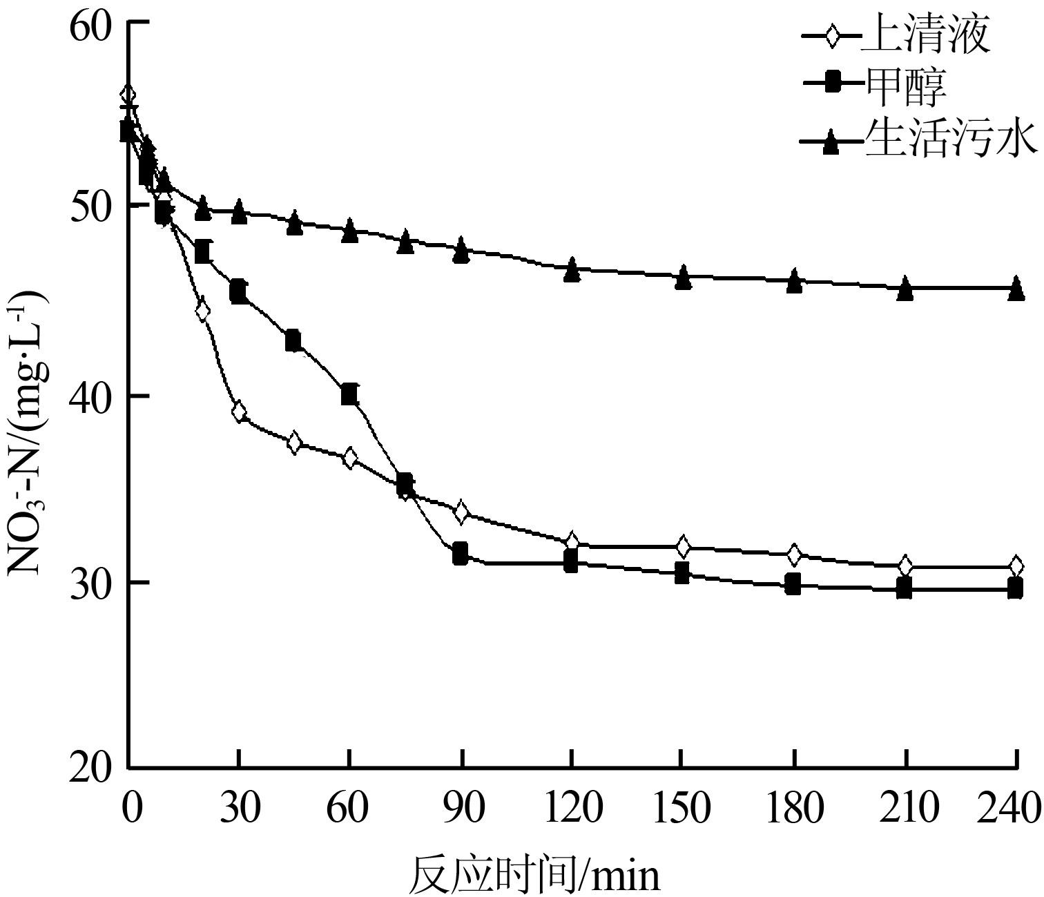 (1)在相同的試驗條件下,采用上清液和生活污水作為反硝化碳源時,系統反硝化過程中NO3--N的降解過程分為三個階段,而以甲醇作為碳源時,NO3--N的降解過程為兩個階段。(2)采用上清液和甲醇作為反硝化碳源時,反應初始階段的NO2--N積累現象明顯高于生活污水作為反硝化碳源,但沒有對反硝化速率造成影響。(3)在相同的試驗條件下,采用上清液代替甲醇作為反硝化系統的外加碳源,可在保持高反硝化速率的同時降低運行成本。