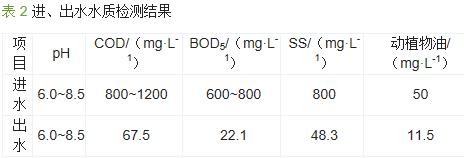 工程于2010年初開始調(diào)試,經(jīng)過3個(gè)月的系統(tǒng)調(diào)試,所有工藝段都已滿負(fù)荷投入正常運(yùn)行,監(jiān)測驗(yàn)收部門對該廢水處理工程進(jìn)行了連續(xù)監(jiān)測,水質(zhì)監(jiān)測結(jié)果取平均值,結(jié)果見表2。