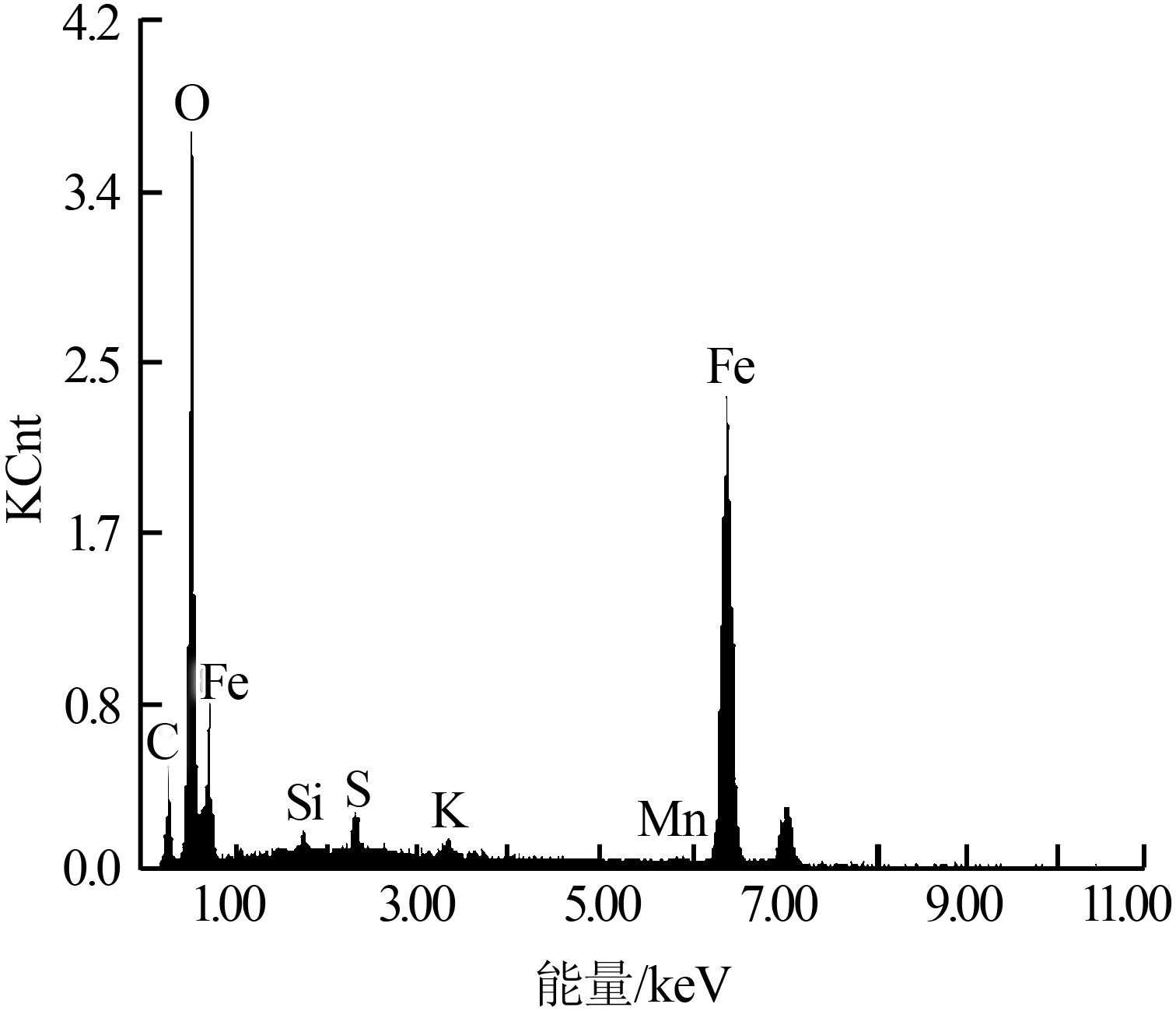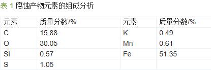 由圖2、表1可見,腐蝕產物主要含有C、O、Fe等元素組成,同時伴有少量Si、S、K、Mn等元素。