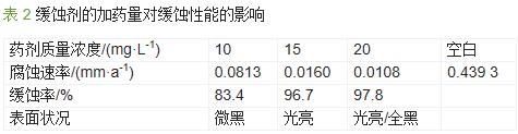 現場取分離器水樣進行緩蝕劑效果室內評價。評價條件:80℃,通CO2除氧10min,同時用CO2加壓至1.2MPa,結果如表2所示。