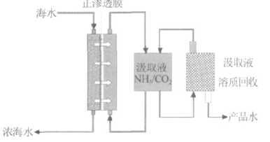2005年,美國耶魯大學M.Elimelech教授課題組開發了一種正滲透海水淡化技術。這項技術的關鍵在于其汲取液,它是將氨氣與二氧化碳按照一定比例混合溶解于水中配制成一定濃度的銨鹽溶液作為汲取液,這種汲取液既具有較高的滲透壓,又能方便地從水中分離,圖2為該系統示意圖〔30〕。據報道,汲取液濃度為6mol/L時,其滲透壓達2.53×107Pa,以0.5mol/LNaCl溶液作原料液,系統滲透壓差達2.17×107Pa。對于稀釋后的汲取液,將其加熱到60℃,其中的銨鹽被分解為氨氣和二氧化碳,采用合適的方法(如蒸餾)就能與水分離,得到產品水,分離出的氨氣和二氧化碳可以循環使用。