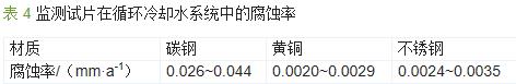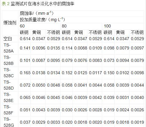(2)以無機磷酸鹽、無機鹽緩蝕劑、有機多元磷酸為主要成分的TS-528G 在海水淡化水中表現出理想的緩蝕效果,現場應用7 個月,碳鋼的腐蝕率可控制在0.05 mm/a 以內,黃銅、不銹鋼的腐蝕率可控制在0.004 mm/a 以內。