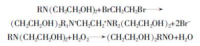 用二溴乙烷(環(huán)氧氯丙烷或二氯乙醚)作為連接基團,把椰油基二羥乙基胺原料中兩個長鏈烷基二羥乙基胺分子通過季銨化反應連接起來制得溴代雙子季銨鹽表面活性劑,用過氧化氫將未轉化的椰油基二羥乙基胺氧化生成椰油基二羥乙基氧化胺,化學反應式如下: