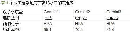 從表 1 可以看出,隨著連接基團碳數(shù)由2 個增加到4 個,雙子季銨鹽的減阻率從69.1%增大到 71.4%,但減阻率上升幅度不大,從雙子季銨鹽原料經(jīng)濟成本考慮,優(yōu)選采用以乙基為連接基團的雙子季銨鹽(Gemini 1)。