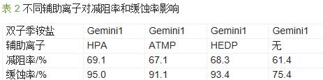 以雙子季銨鹽(Gemini 1)作為主體分子,分別以包含陰離子的緩蝕劑2-羥基膦乙酸(HPA) 、氨基三亞甲基膦酸(ATMP) 和羥基亞乙基二膦酸(HEDP)作為輔助離子得到3 種減阻劑配方,在循環(huán)水溫度40 ℃,流速3 m/s,雙子季銨鹽添加濃度 1 000 mg/L,緩蝕劑添加濃度500 mg/L 下測定其減阻率和緩蝕率,并與未加輔助離子時的結果對比,結果如表 2 所示。