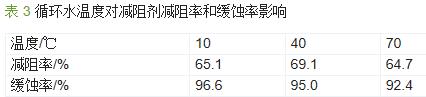由表 3 可見,雙子季銨鹽減阻劑在10~70 ℃溫度范圍內(nèi)減阻率為64.7%~69.1%,緩蝕率為92.4%~ 96.6%,受循環(huán)水溫度影響很小。一方面原因是雙子季銨鹽分子中既含有適合高溫熱水減阻的長鏈表面活性劑分子,又含有適合低溫冷水減阻的羥乙基頭基; 另一方面原因是椰油基二羥乙基胺雙子季銨鹽是不同鏈長的對稱和不對稱雙子季銨鹽混合物,綜合性能優(yōu)良。