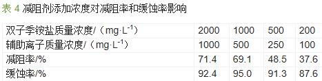 以雙子季銨鹽(Gemini 1)作為主體分子,緩蝕劑2-羥基膦乙酸(HPA)作為輔助離子組合得到減阻劑配方,在循環(huán)水溫度40 ℃,流速3 m/s,添加不同濃度減阻劑條件下測定減阻率和緩蝕率,結果如 表 4 所示。