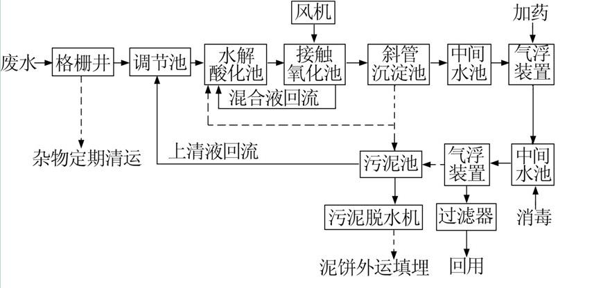 廢水經管網收集后首先進入格柵井,以去除廢水中的漂流物和大顆粒雜質。格柵井出水進入調節池,進行水量水質均化調節。調節池出水由提升泵送至水解酸化池,進行酸化水解和硝化反硝化,以降低有機物濃度。水解酸化池出水自流進入接觸氧化池進行好氧生化反應,在此絕大部分有機污染物通過生物氧化、吸附得以降解。接觸氧化池出水經加藥(PAC)后自流至沉淀池,固液分離后,上清液流入中間水池,再經投加藥劑(PAM、ClO2)后提升至氣浮設備,進一步去除污水中的有機物、懸浮雜質和有害病毒,降低污水色度。氣浮裝置出水再經過濾器處理,出水水質更佳,可確保出水達到回用要求。