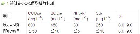 根據該廠提供的資料,本項目所處理的廢水主要為生產廢水和部分生活污水,廢水排放量為800 m3/d.廢水處理設施每天24 h連續運行,廢水處理設計流量為33.33 m3/h.設計進水水質及排放標準見表 1。