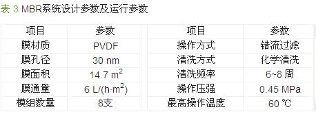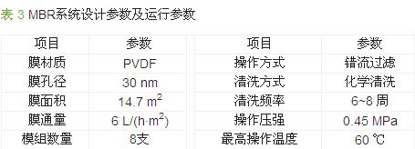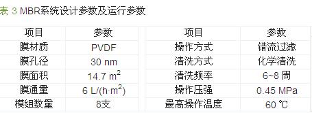 浸沒式MBR裝置置于室內的膜處理車間,處理水量按7.5 m3/h設計,另外,配套鼓風機(Q=2m3/min,N=5.5 kW)為膜組件供氣。該MBR系統設計及運行參數見表 3。