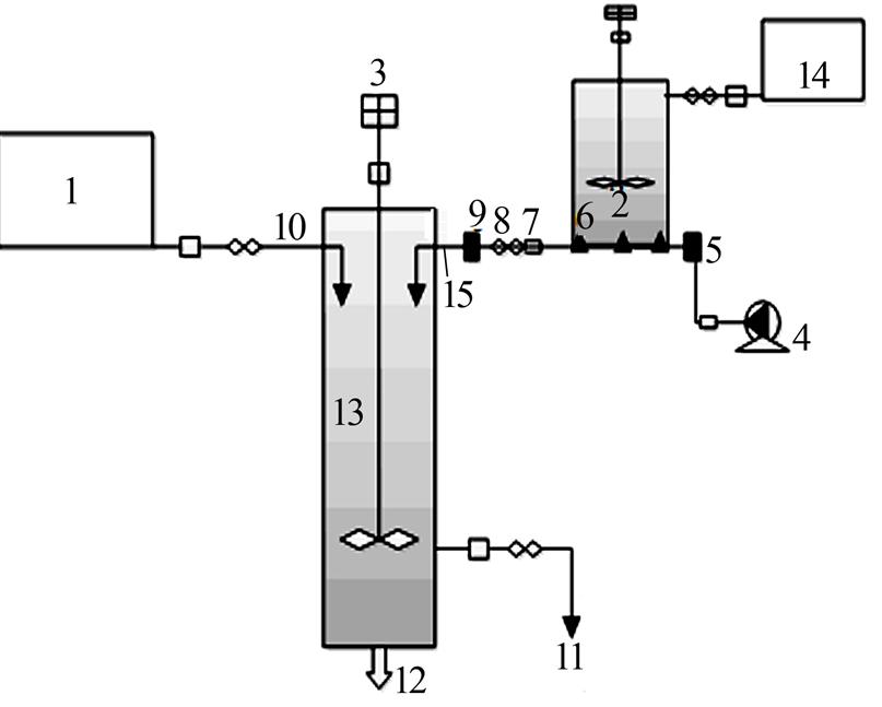 1—A2SBR進水箱;2—NSBR反應器;3—電動攪拌機;4—曝氣泵;5—氣體流量計;6—曝氣頭;7—時間繼電器;8—電磁閥;9—液體流量計;10—A2SBR進水管;11—A2SBR排水管;12—排泥口;13—A2SBR反應器;14—NSBR進水箱;15—NSBR出水管。