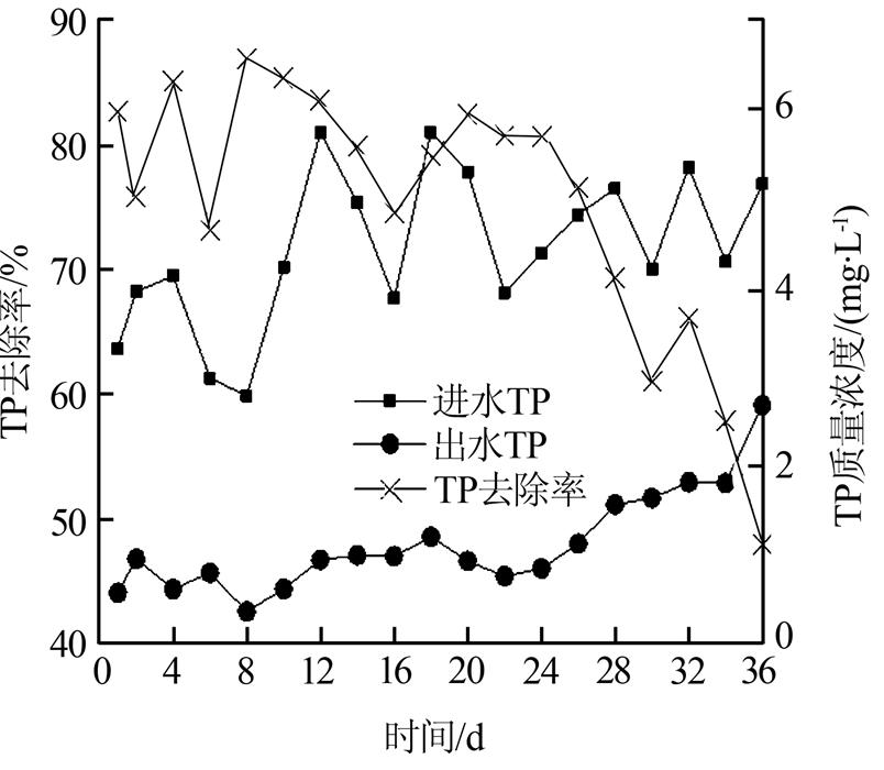 由圖 2可以看出,連續(xù)36 d不排泥,系統(tǒng)仍有處理效果,沒有發(fā)生出水磷濃度大于進水的情況,但除磷效果不是很穩(wěn)定,除磷率在48.00%~86.75%波動。系統(tǒng)運行第24天之前,出水磷質(zhì)量濃度均小于1 mg/L,達到《城鎮(zhèn)污水處理廠污染物排放標準》一級B標準,平均去除率為80.67%,系統(tǒng)運行到第26天后,除磷效果逐漸變差,除磷率開始下降,到第36天時,出水磷質(zhì)量濃度為2.68 mg/L,磷去除率為48.00%,由此可推斷,在系統(tǒng)不排泥的情況下,仍有除磷效果,但連續(xù)運行超過24 d后,除磷效果開始下降。這與傳統(tǒng)除磷理論認為泥齡越短除磷效果越好的說法不一致,因為厭氧/缺氧條件下生長的反硝化聚磷菌DPAOs比傳統(tǒng)聚磷菌PAO生長速率慢,所以其SRT比PAOs的長,這與石玉明等結(jié)論相同〔7, 8〕。