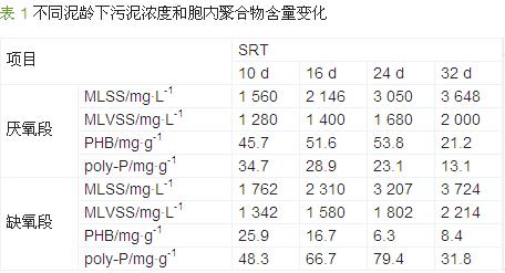 表 1是SRT為10、16、24、32 d的生物除磷反應器在不同泥齡條件下運行過程中,污泥濃度和胞內(nèi)聚合物的含量變化情況。