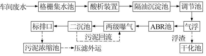 針對(duì)該類廢水水質(zhì)水量不穩(wěn)定、變化大、有機(jī)物濃度高、動(dòng)植物油及懸浮物含量高等特點(diǎn),設(shè)計(jì)采用物化+生化的處理工藝,具體設(shè)計(jì)工藝流程見圖 1。