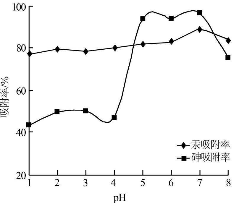 在剩余污泥投加量為100 g/L,吸附時間為12 h的條件下,考察了pH對剩余污泥吸附汞和砷的影響,結(jié)果見圖 1。