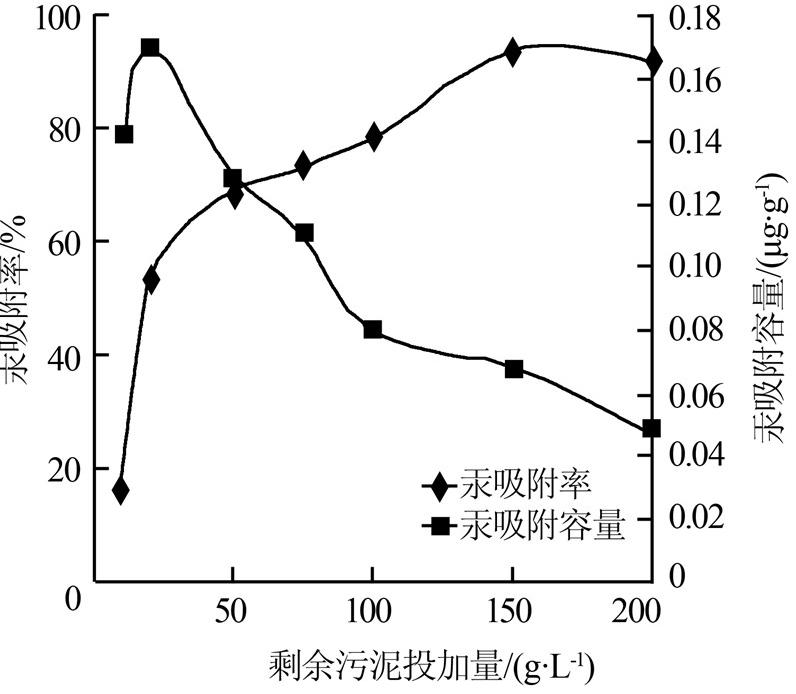 實驗結(jié)果表明,剩余污泥吸附汞、砷的適宜投加量并不相同,剩余污泥吸附砷的最佳投加量為100 g/L,而剩余污泥吸附汞的最佳投加量為150 g/L.這說明在工程應(yīng)用中,吸附砷所需的剩余污泥量小于吸附汞所需的剩余污泥量。為使剩余污泥對汞、砷的吸附均能達(dá)到最佳效果,后續(xù)實驗選擇剩余污泥投加量為150 g/L。