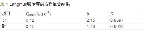 由表 1可知,剩余污泥對汞、砷的最大吸附容量分別為0.12、0.15 μg/g,這驗證了剩余污泥吸附砷比吸附汞要更容易。b可以表示被吸附離子與吸附劑結(jié)合的穩(wěn)定程度,b值越大,說明吸附的穩(wěn)定程度越高〔6〕。從表 1可以看出,汞與剩余污泥結(jié)合的穩(wěn)定性要優(yōu)于砷。另外,從二者的相關(guān)系數(shù)可以看出,剩余污泥對汞、砷的吸附能較好地符合Langmuir方程。