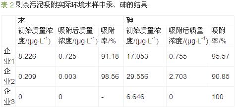 從上述實驗中得出了在模擬水樣環(huán)境下,剩余污泥吸附汞、砷的最佳吸附條件:pH=7,剩余污泥投加量為150 g/L,吸附時間為12 h.在此條件下,采用剩余污泥對本市3家涉汞、砷企業(yè)的實際水樣進(jìn)行了處理,結(jié)果如表 2所示。
