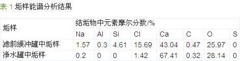 系統(tǒng)運行1 a后發(fā)現(xiàn),緩沖罐和凈水罐中出現(xiàn)嚴重結垢現(xiàn)象。為了確定垢樣成分和結垢條件,對緩沖罐和凈水罐中的水和結垢物進行了取樣分析。