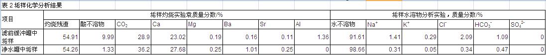 (2)依據壓裂返排液水質特性,并結合現(xiàn)場處理工藝,得到導致結垢的原因:壓裂返排液中含有鈣離子和碳酸氫根離子,處理過程中又采用石灰乳調節(jié)pH,使水中碳酸鈣結垢趨勢增加。