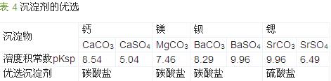 由表 4可知,對鈣、鎂、鍶離子可選擇可溶性碳酸鹽作為沉淀劑,對于鋇離子則應使用硫酸鈉作為沉淀劑。綜合考慮處理效果、操作難易程度和成本因素,最終選擇使用碳酸鈉作為沉淀劑。
