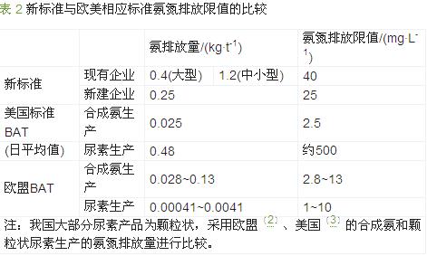 與歐、美等國(guó)家和地區(qū)相比(見表 2)可見,美國(guó)的合成氨生產(chǎn)環(huán)節(jié)氨氮的排放量很小,而尿素生產(chǎn)的氨氮排放量較大,與我國(guó)采用解吸工藝處理尿素工藝廢水的排放量相當(dāng)。美國(guó)標(biāo)準(zhǔn)氨氮限值為20世紀(jì)70年代制定的,其可參考性有一定局限。新標(biāo)準(zhǔn)氨氮限值與歐盟的BAT技術(shù)氨氮排放限值基本在同一水平,略為寬松,主要是因?yàn)槲覈?guó)以煤制氨為主,而歐盟基本為天然氣蒸汽轉(zhuǎn)化法制氨,兩者在產(chǎn)排污系數(shù)上存在較大差異。總體而言,GB 13458-2013的污染物排放控制水平反映了我國(guó)合成氨工業(yè)生產(chǎn)產(chǎn)排污特點(diǎn),