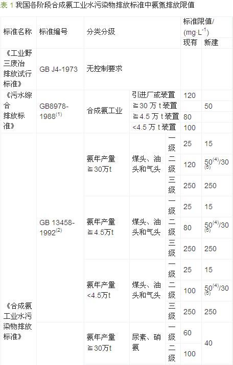 從20世紀(jì)70年代開始,我國(guó)在氮肥的生產(chǎn)、使用以及氮肥技術(shù)的研究和普及方面都得到了比較迅猛的發(fā)展,但當(dāng)時(shí)合成氨工業(yè)是以小型廠生產(chǎn)低濃度氮肥為主,工藝落后,污染物排放量大、濃度高,且治理技術(shù)不完善,因此在當(dāng)時(shí)情況下GB 8978-1988中合成氨工業(yè)的氨氮排放限值比其他行業(yè)較為寬松。