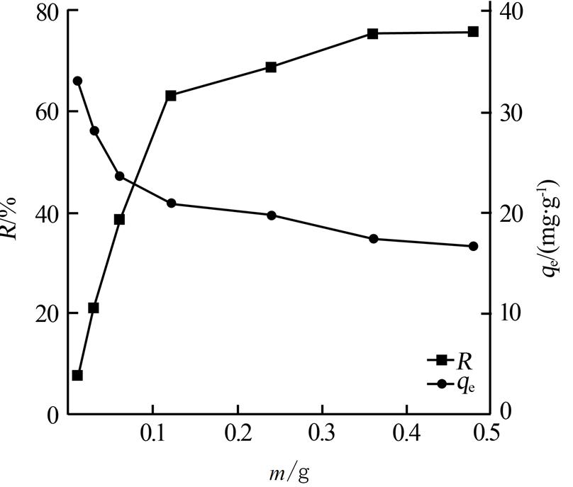 從圖 1可以看出,粉煤灰對焦化廢水中揮發酚的吸附量先降低后逐漸趨于平衡;當粉煤灰質量從0.01 g增加到0.24 g時,粉煤灰對揮發酚的吸附量從33.1 mg/g減少到19.8 mg/g,對揮發酚的去除率從7.64%增加到69.0%,說明通過添加適量的粉煤灰可以有效控制廢水中揮發酚的含量。