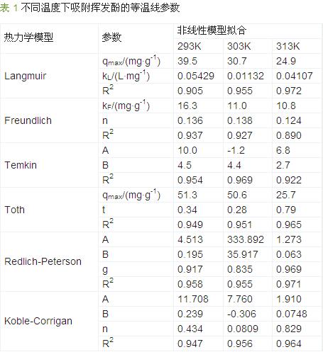 吸附等溫線是用來分析吸附能力和設計吸附試驗的基礎。主要采用Freundlich方程、Langmuir方程、Temkin 方程、Toth方程、Redlich-Peterson方程和Koble-Corrigan 6種等溫線模型〔16〕來擬合試驗數據,結果見表 1。從表 1可以看出,6種等溫線模型的相關系數R2除了313 K 時的Freundlich模型(0.890)之外,均大于0.9,說明這6種等溫線模型都適用于該吸附反應,也表明實際廢水的吸附過程比較復雜。其中Redlich-Peterson模型的相關系數最大(平均R2=0.961),相對擬合度最好。Langmuir常數qmax表示單分子層飽和吸附容量,kL越大表示吸附劑與吸附質的親和力越強〔17〕,在293、303、313K時,qmax分別為39.5、30.7、24.9mg/g,即隨著吸附溫度的升高,粉煤灰與揮發酚的表面親和力越小,單分子層飽和吸附量越低;Freundlich模型得到的n介于0.1~1,表明在這個溫度范圍內粉煤灰有較好的吸附能力〔18〕;Temkin參數B和Toth參數qmax隨著溫度的升高,逐漸減小;Redlich-Peterson和Koble-Corrigan兩種等溫吸附方程比較相似,參數g、n和1比較接近,與Langmuir模型很接近〔19〕,說明了Langmuir吸附模型的可靠性。綜上,Langmuir吸附模型擬合度較高且模擬飽和吸附量與實測平衡吸附量比較接近,可以較好地描述此溫度范圍內該體系的吸附規律。