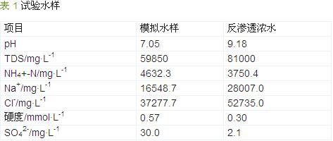 試驗所用水樣為模擬水樣和反滲透濃水兩種,模擬水樣是按電廠凝結水精處理系統酸堿再生廢水反滲透回收現場試驗的濃水水質配制而成,反滲透濃水則取自現場試驗的濃水,主要水質見表 1。