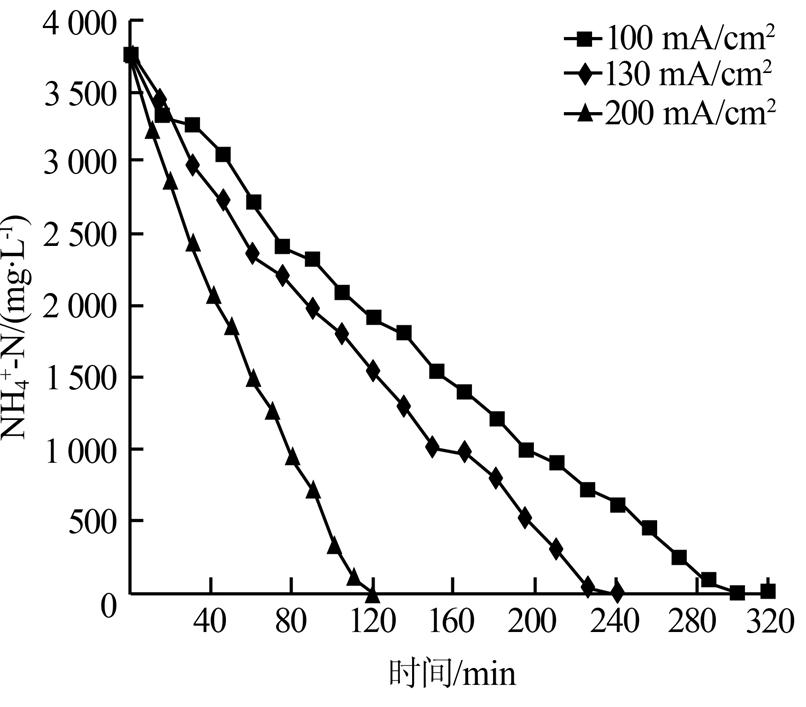 由圖 1可見,不同電流密度下,氨氮濃度隨電解時間呈近似線性下降,電流密度越大,氨氮去除速率越快。在電流密度100、130、200 mA/cm2條件下,分別電解300、240、120 min左右可將氨氮完全去除。同時通過考察不同電流密度下的電解能耗(以去除單位質量氨氮計算,下同)可知,在氨氮降解過程中,平均能耗隨時間逐漸上升,且高電流密度能耗略高于低電流密度能耗,電解末期平均能耗在0.091~0.098 kW·h/g。