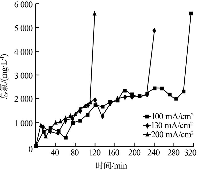 圖 2 不同電流密度下總氯變化曲線