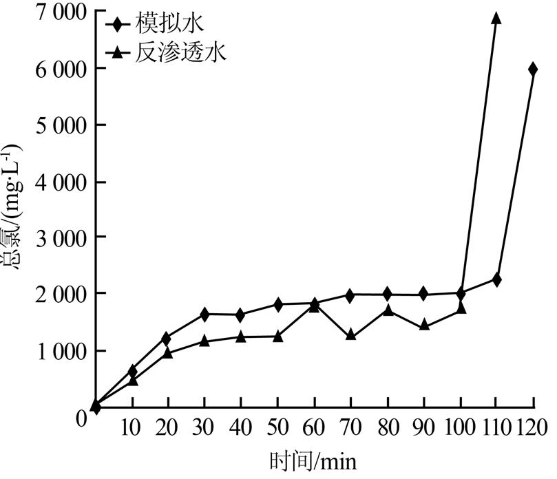 電解試驗方法:試驗過程中采用恒電流電解,分別控制電流密度為100、130、200 mA/cm2進行試驗。每次電解的水樣為2 L(水樣為模擬水樣和反滲透濃水),電解槽放入恒溫水浴,控制反應溫度在30 ℃以下。試驗期間每15 min取樣1次,測定水樣氨氮、總氯、游離氯、Cl-。根據測定結果分析電流密度、TDS、pH、極板清洗等因素對電解除氨氮及制氯過程的影響。