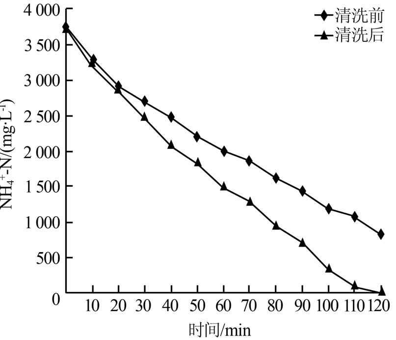 由圖 5可見,極板清洗前、后氨氮的降解速率差異較大,極板清洗后氨氮降解速率較快,電解120 min可將氨氮完全去除,而相同時間內清洗前的極板對氨氮的去除率僅有77.7%。這說明極板表面的污染、結垢會降低DSA陽極涂層的電催化活性,對電解除氨氮影響很大。通過考察極板清洗前后電解能耗變化可知,極板清洗后的電解平均能耗低于清洗前。極板清洗前,電解末期平均能耗0.119kW·h/g,極板清洗后,電解末期平均能耗0.091kW·h/g。