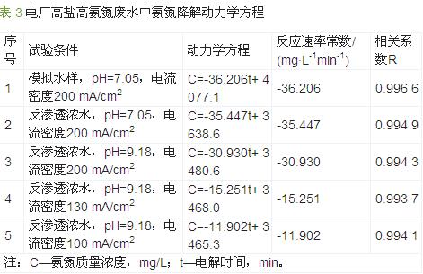 根據氨氮的間接電化學氧化機理,當溶液中存在足量的氯離子條件下,電解生成的有效氯足夠與氨氮發生氧化還原反應,反應過程不受有效氯限制。從試驗結果看,電解過程中氨氮濃度與電解時間呈近似線性關系,采用一元線性回歸對試驗數據進行處理,得到各試驗條件下氨氮降解的動力學方程、表觀反應速率常數及線性相關系數,結果見表 3。從動力學方程看,高鹽條件下,氨氮的電化學氧化符合準零級反應動力學規律。具體參見http://www.bnynw.com更多相關技術文檔。