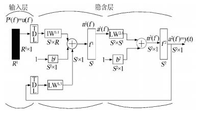 圖 1中,TDL表示時(shí)延;IW1,1表示網(wǎng)絡(luò)輸入向量連接隱含層的權(quán)值;b1表示網(wǎng)絡(luò)隱含層的閾值;b2表示網(wǎng)絡(luò)輸出層的閾值;LW1,3表示網(wǎng)絡(luò)輸出層連接隱含層的權(quán)值;f1表示神經(jīng)網(wǎng)絡(luò)隱含層激活函數(shù);LW2,1表示網(wǎng)絡(luò)隱含層連接輸出層的權(quán)值;f2表示神經(jīng)網(wǎng)絡(luò)輸出層激活函數(shù)。