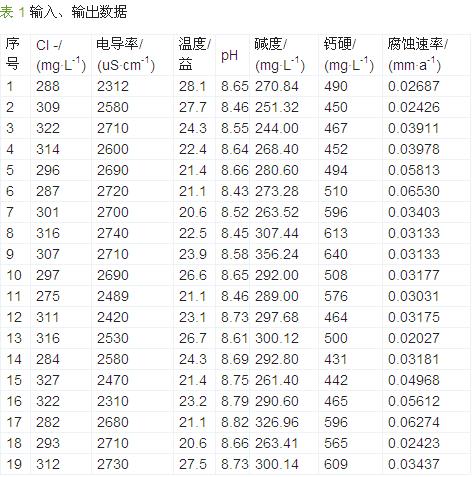 腐蝕現(xiàn)象是循環(huán)冷卻水系統(tǒng)中經(jīng)常出現(xiàn)的水質(zhì)故障,可嚴(yán)重影響生產(chǎn)裝置的正常運(yùn)行,造成嚴(yán)重的經(jīng)濟(jì)損失以及水資源的浪費(fèi)。冷卻水的水質(zhì)、溶解氧、溫度、流動狀態(tài)、濁度等對腐蝕均有影響。由于多種影響因素與腐蝕速率之間屬多元高次的非線性關(guān)系,利用常規(guī)的方法難以建立精確的數(shù)學(xué)模型。