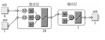 創(chuàng)建NARX神經(jīng)網(wǎng)絡(luò),將表 1中的數(shù)據(jù)分為訓(xùn)練樣本、驗(yàn)證樣本和測試樣本3個(gè)部分。輸入層節(jié)點(diǎn)為6,輸出層節(jié)點(diǎn)為1,訓(xùn)練函數(shù)選用“trainlm”,經(jīng)過反復(fù)調(diào)試和修改神經(jīng)網(wǎng)絡(luò)參數(shù),最終確定網(wǎng)絡(luò)隱藏節(jié)點(diǎn)為24,延遲階數(shù)為1∶2時(shí),訓(xùn)練結(jié)果較好。網(wǎng)絡(luò)模型如圖 5所示。
