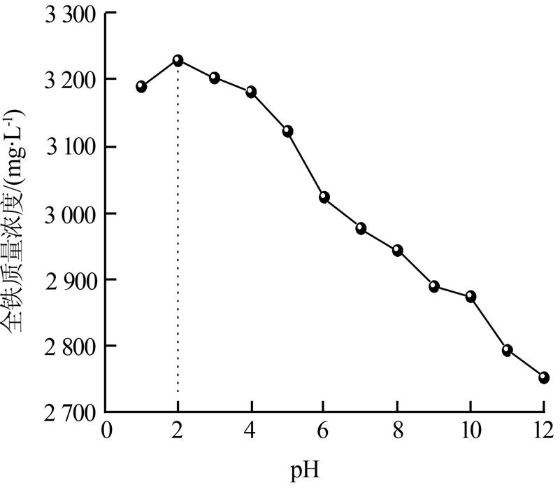 由圖 1可知,pH在1~2的范圍內,廢液中全鐵測定質量濃度從3 189 mg/L上升至3 228 mg/L,在pH=2.0時為最大;隨著廢液pH的不斷升高,全鐵濃度逐漸下降,在pH為12時,全鐵測定質量濃度為2 752 mg/L;當pH超過12后達到13時,廢液中全鐵測定質量濃度非常小,為421 mg/L,究其原因是由于溶液中pH過高不能形成絡合物而生成了氫氧化鐵沉淀。因此在全鐵含量測定的過程中,將廢液的pH控制在2.0左右為宜。