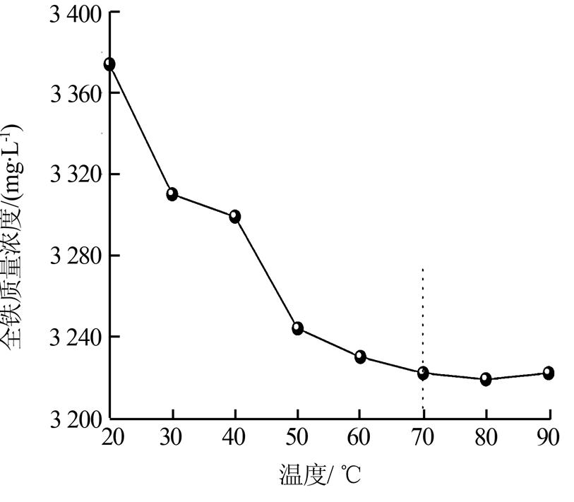 溫度直接影響配合物生成的穩定性,進而影響全鐵測定結果的準確性。調節廢液pH=2.0,在氧化劑為10 d內,EDTA滴定濃度為0.015 0 mol/L的條件下,實驗分別研究了廢液溫度在20、30、40、50、60、70、80、90 ℃的情況下,溫度對全鐵測定結果的影響,結果見圖 2。